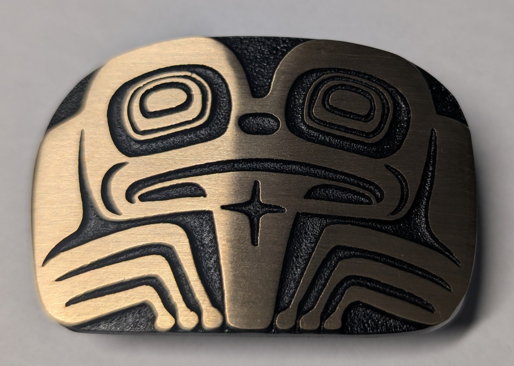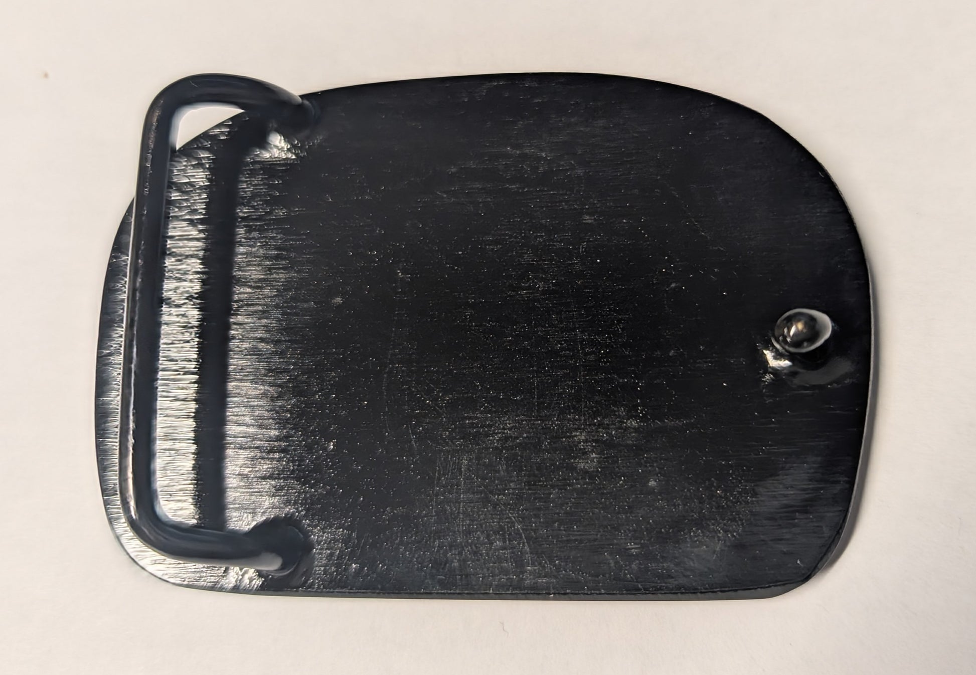 Solid Bronze. About 3 inches wide, by 2 inches tall. Fits a 1 1/2" Belt. Made by Rainbow Metals in Monroe, WA.